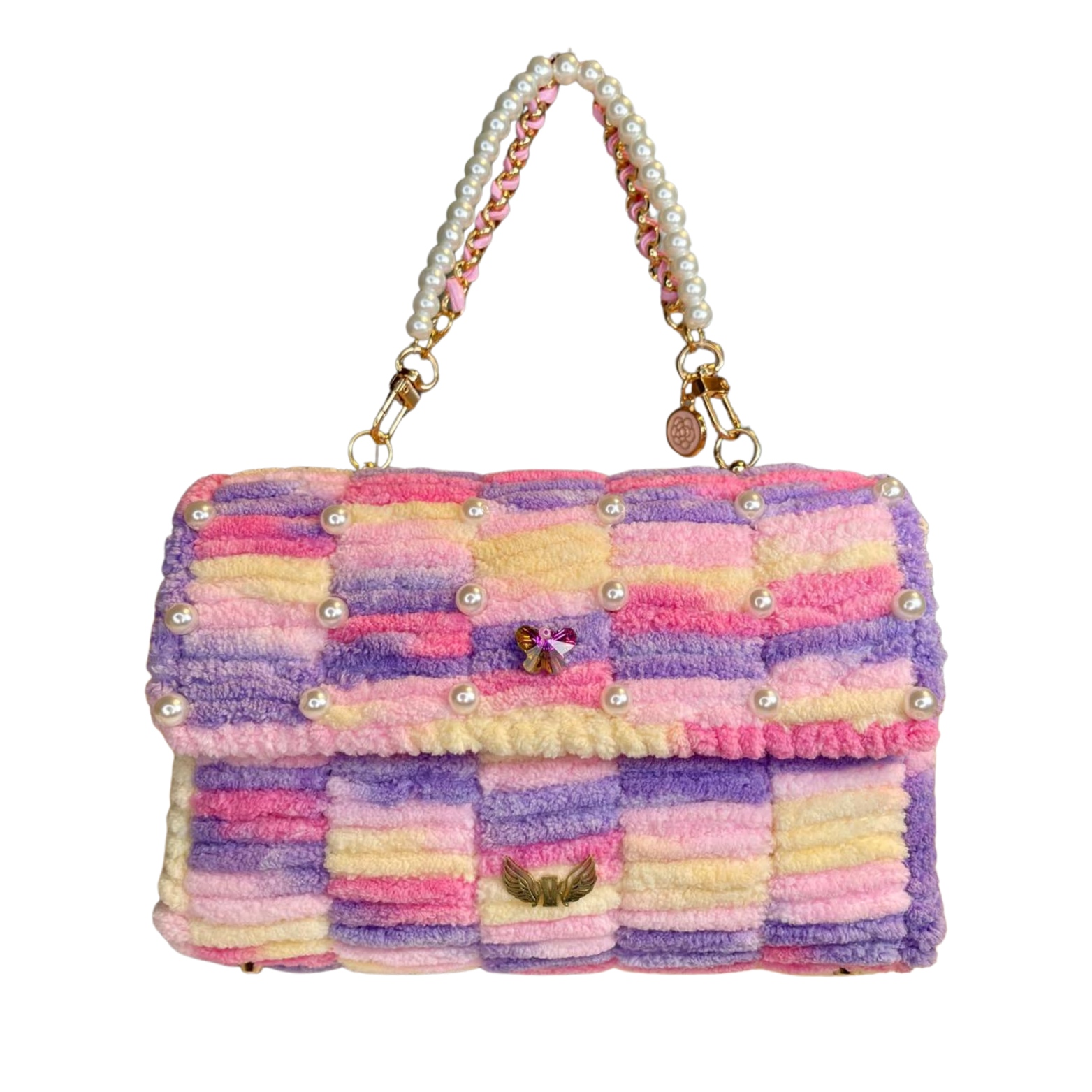 Andara is a handcrafted handbag in shades of violet and pink, with delicate pearl details. A unique design that celebrates eternal love and the magic of traveling through the galaxies.