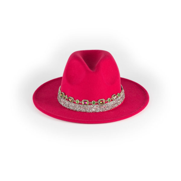 Diamont  is a fuchsia fedora, with a 7-centimeter brim, with embroidered details in silver rhinestones.