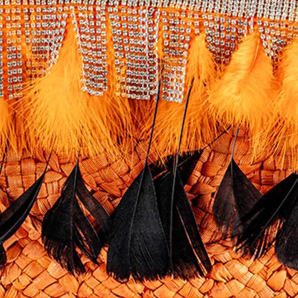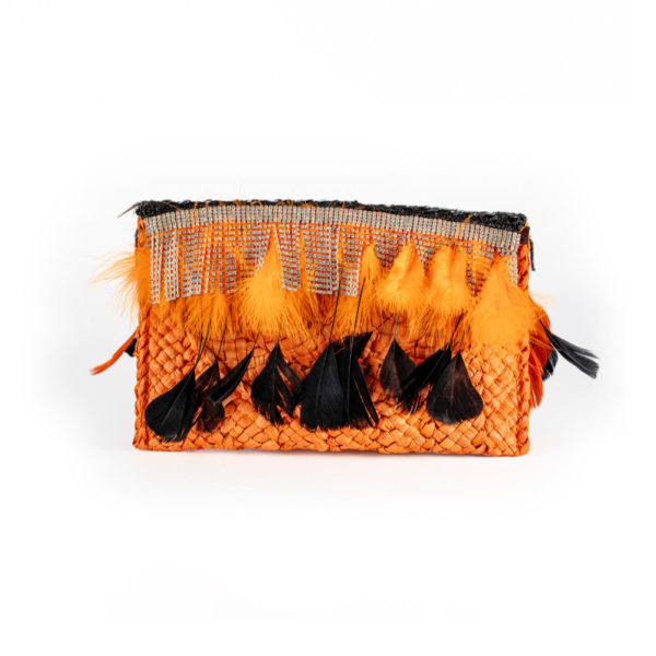 Ibiza is an orange raffia clutch bag, with marabou and ostrich feathers, and black rhinestones.