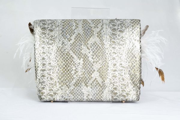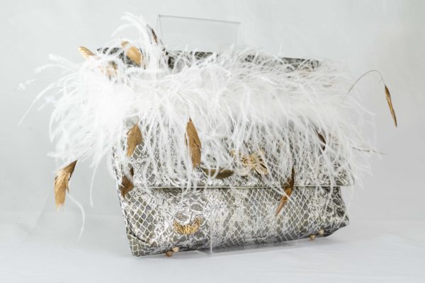 Made with a delicate gray and gold fabric, Nardo Nacar has white and gold marabou feathers embroidered. It is an authentic collectible piece, to make you feel unique at any event.