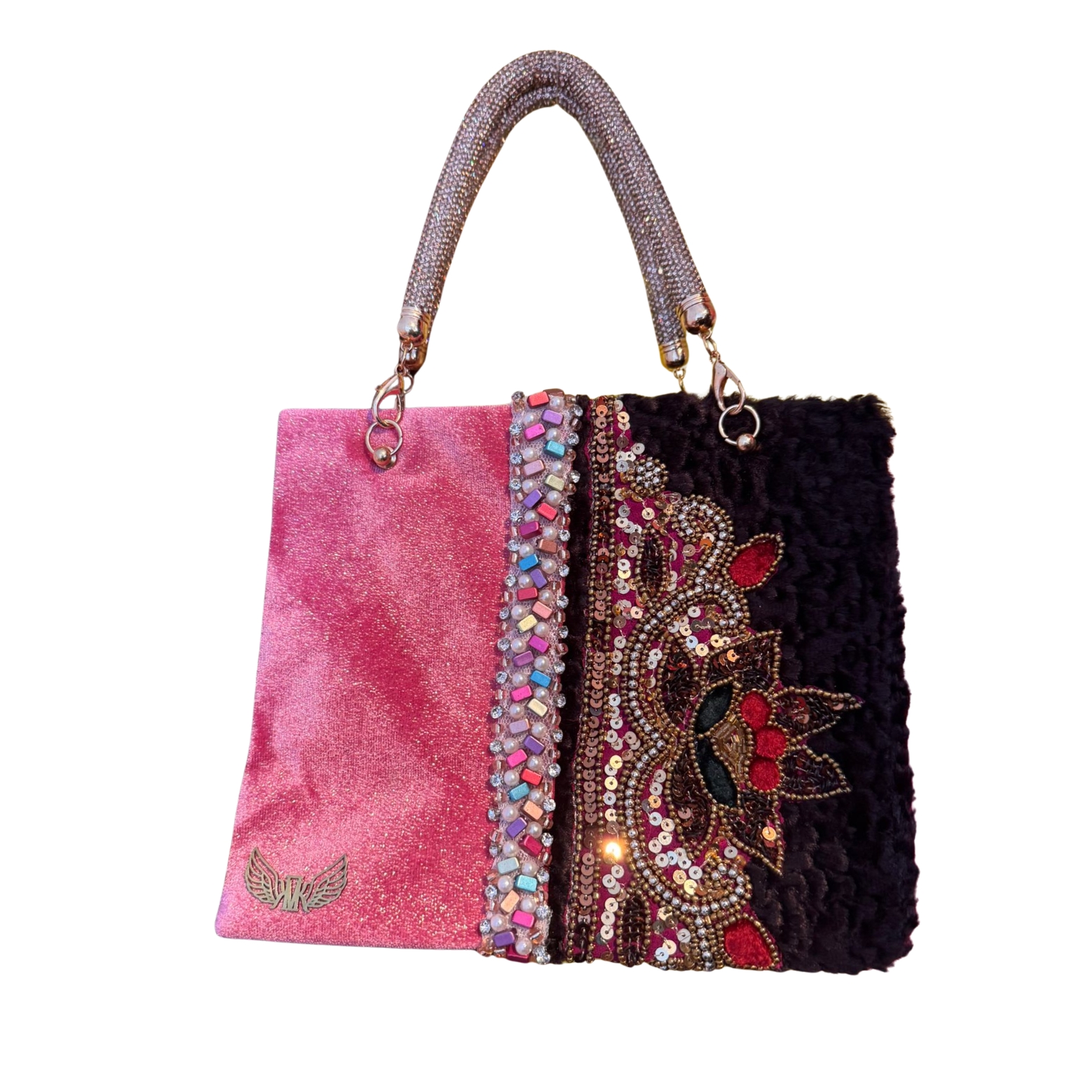 Sahra is a handcrafted clutch in shades of pink and burgundy, with delicate embroidered details. A unique design that evokes the warmth and mystery of the moon in the desert.