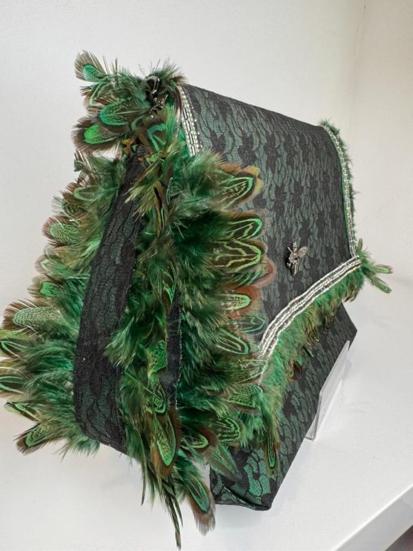Aloe Aristocrata es una Pochette confeccionada a mano en color verde, inspirada en la naturaleza esta pochette esta repleta de bordados en pluma del mismo color, elegante y versatil es una autentica pieza de colección.