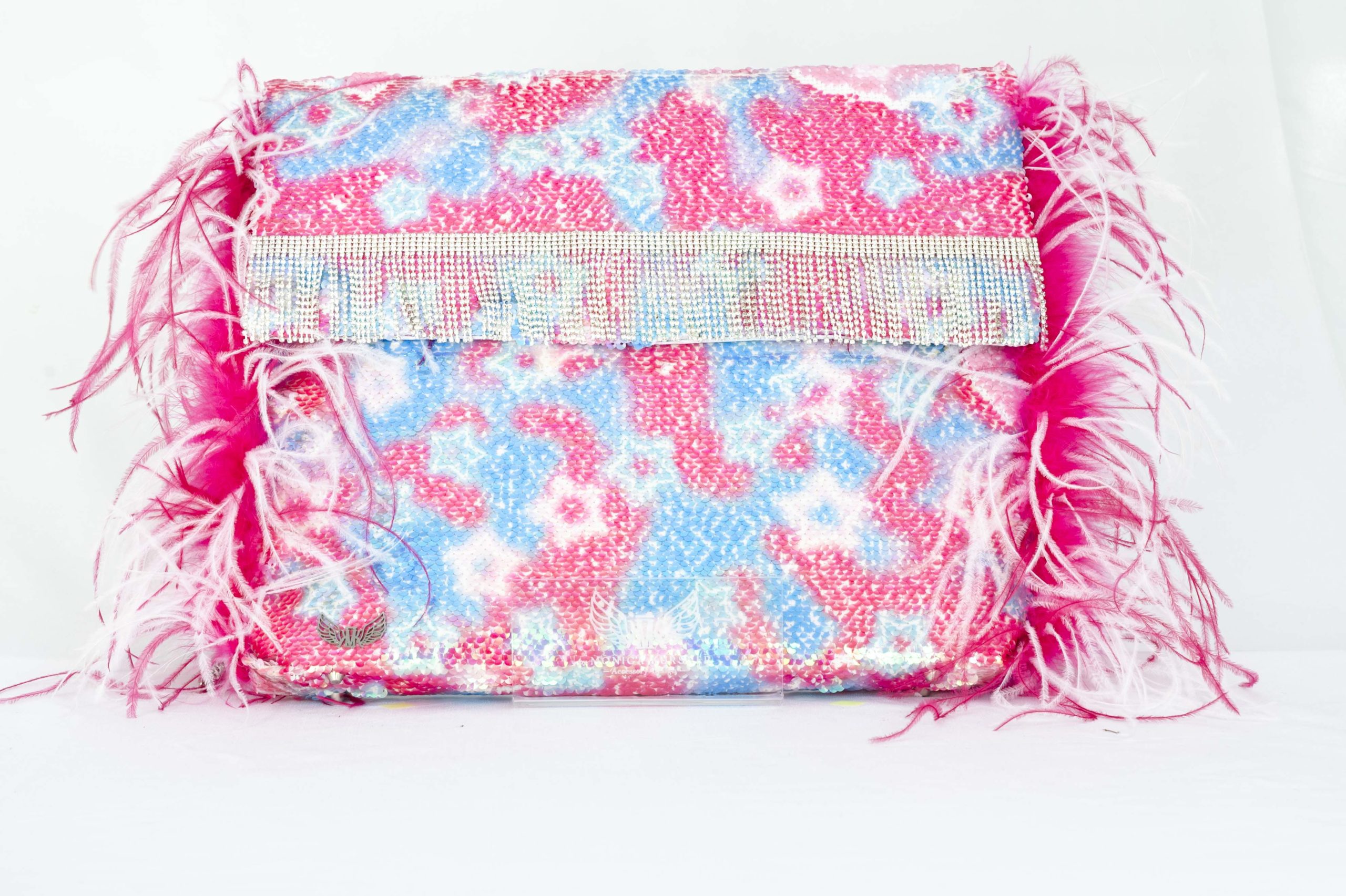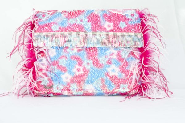 Brillante Bruma es una pochette confeccionada a mano con lentejuelas en colores pasteles celeste y rosa terminada con bordados en plumas de marabout en color rosa