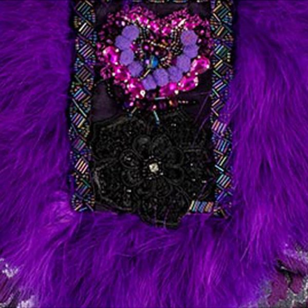 Luxemburgo es un Pochette de la Linea XL, confeccionado en tela en color morado, con bordado de plumas de marabú y aplique central bordado a mano con strass y lentejuelas.