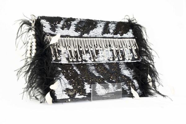 Luxor Prestige es una pochette confeccionada a mano con lentejuelas en color negro y blanco, terminada con bordados en plumas de marabout y avestruz en color negro y blanco.