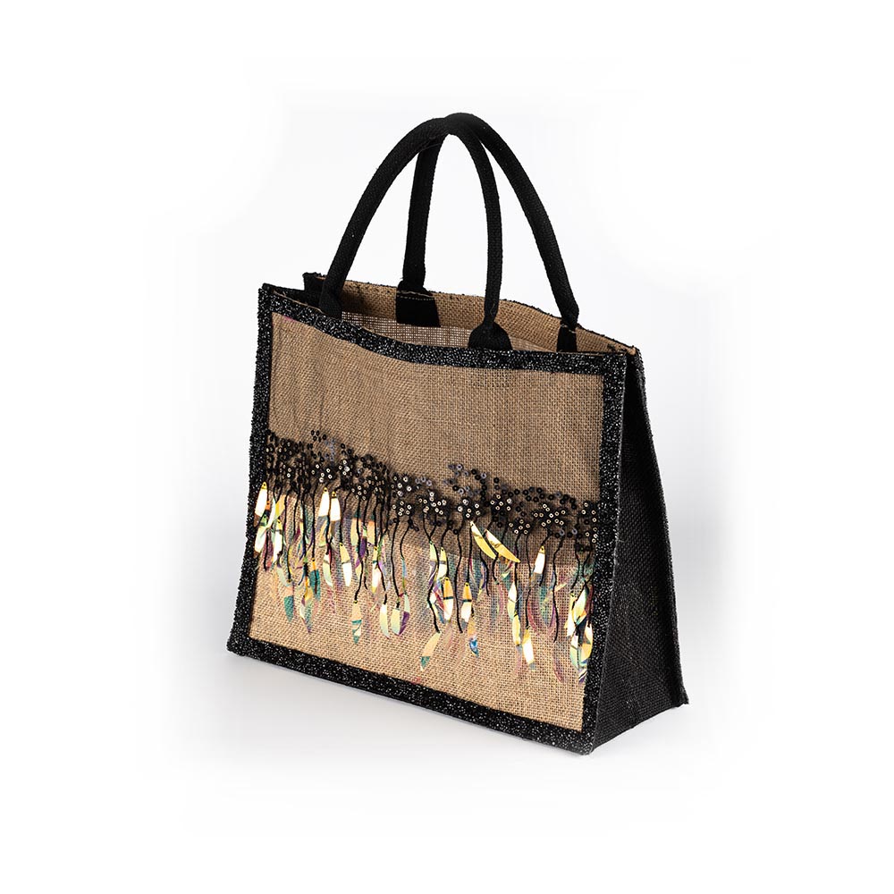Bolso Mallorca, realizado en rafia natural y negra, con detalles en lentejuelas negras y strass.