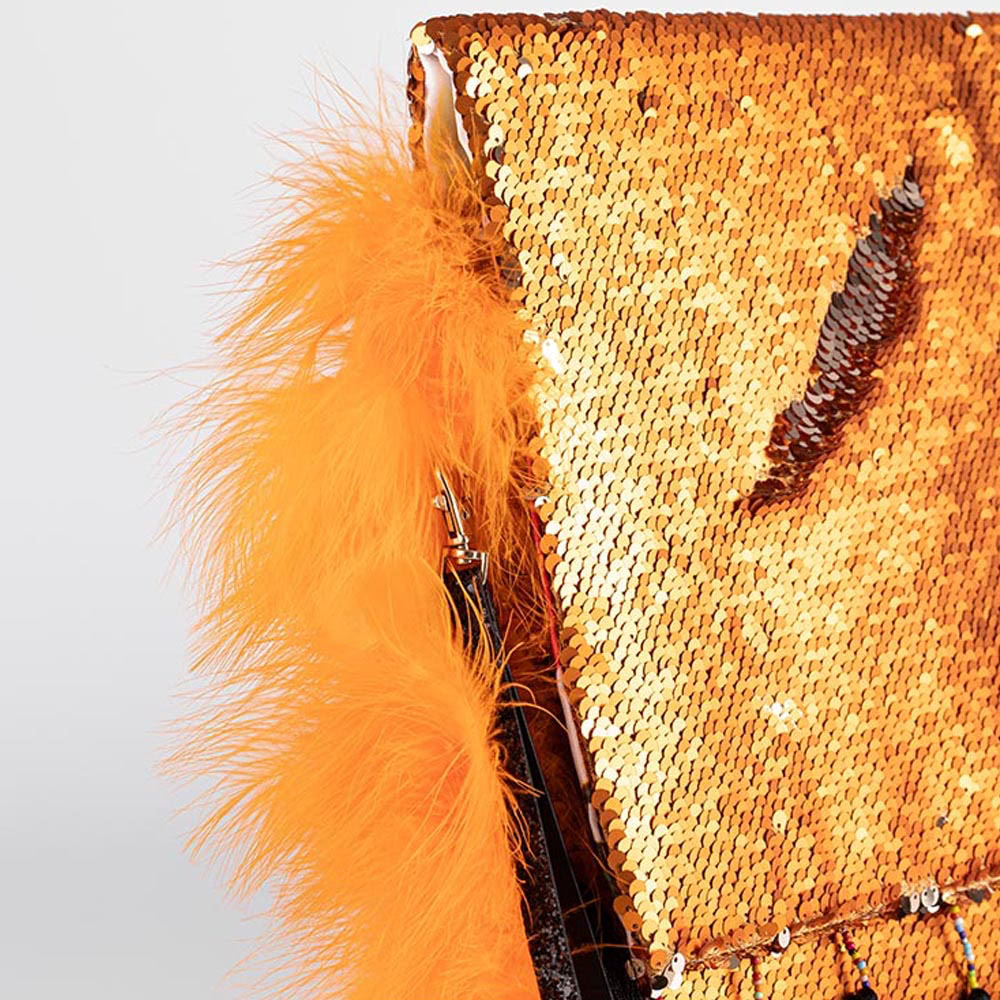 Positano es un bolso de mano XL naranja, con mucho brillo y lentejuelas, combinado con plumas del mismo color en los laterales.