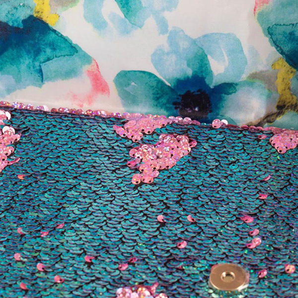 Saint Tropez es un Pochette de la linea XL realizado en tela con lentejuelas y coloreado entre azul y rosa y plumas de marabú rosa.