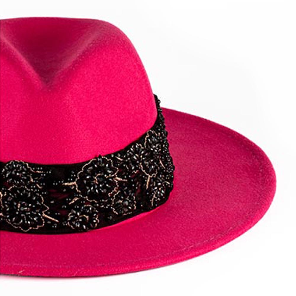 Le chapeau Davos est un fedora fuchsia, avec un bord de 7 centimètres combiné à des broderies de fleurs et de paillettes noirs.