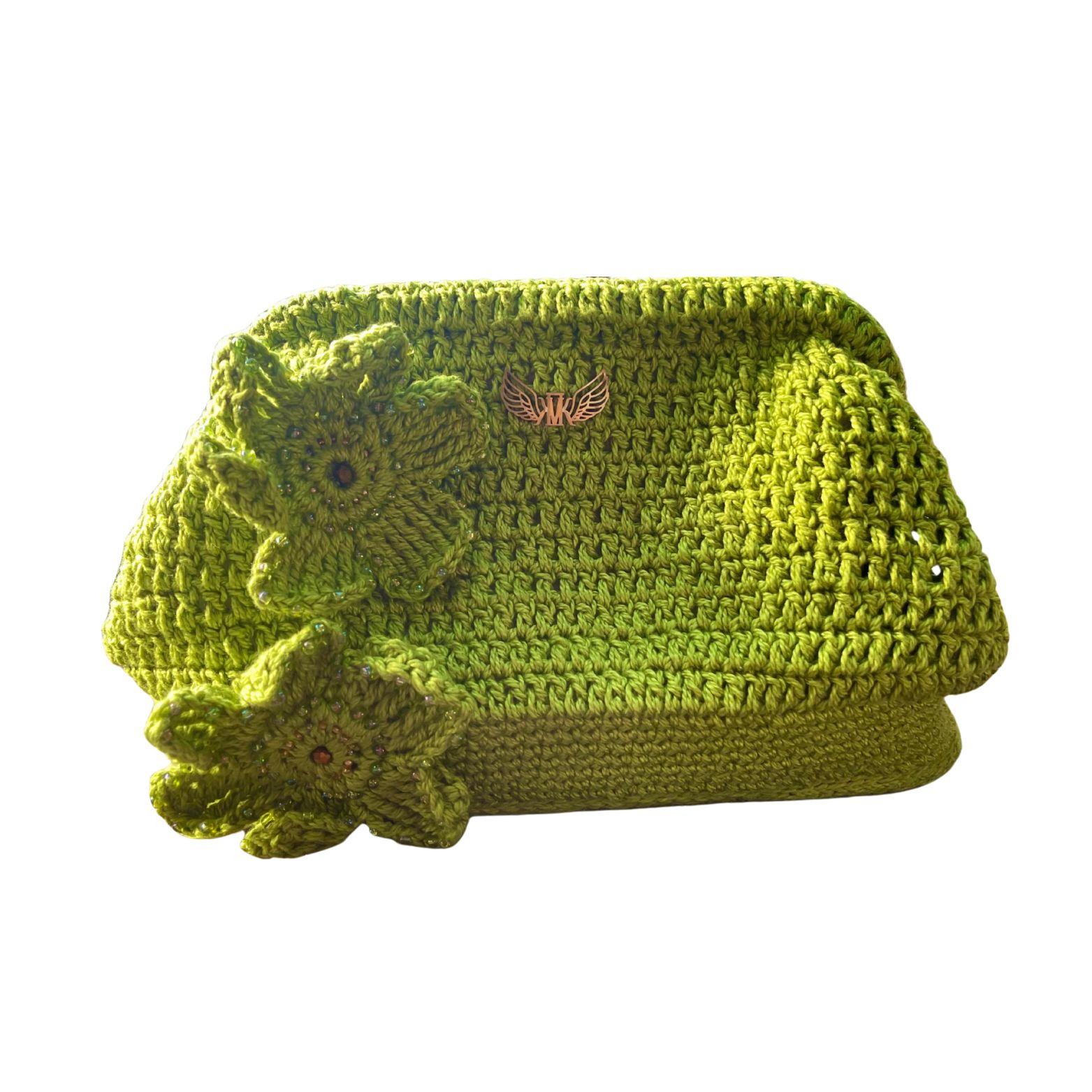 Lyra est une pochette verte tricotée à la main, ornée de délicats motifs floraux sur le côté. Un modèle unique qui évoque une mélodie étoilée, vibrant silencieusement, naturellement et avec élégance.